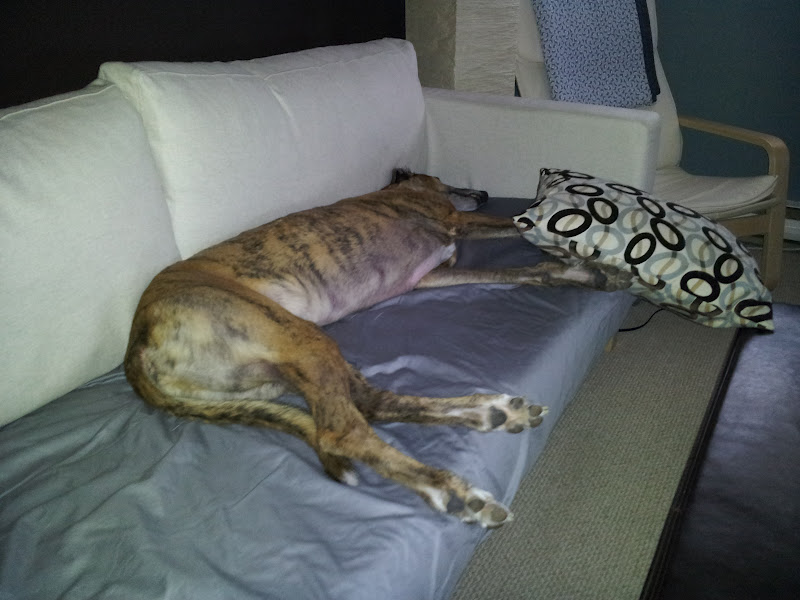 Our morning walk led us to Nana's for a little visit.... We didn't stay too long, Rye-Lee had to do his morning thing. Off we walked home, towards the end of the walk I got my limp on. Devin picked me up so I wouldn't have to walk over the evil parking lot pavement and placed me down on the grass out front our building. Once back at home, I stirred around a bit in my nest before making it to the couch.